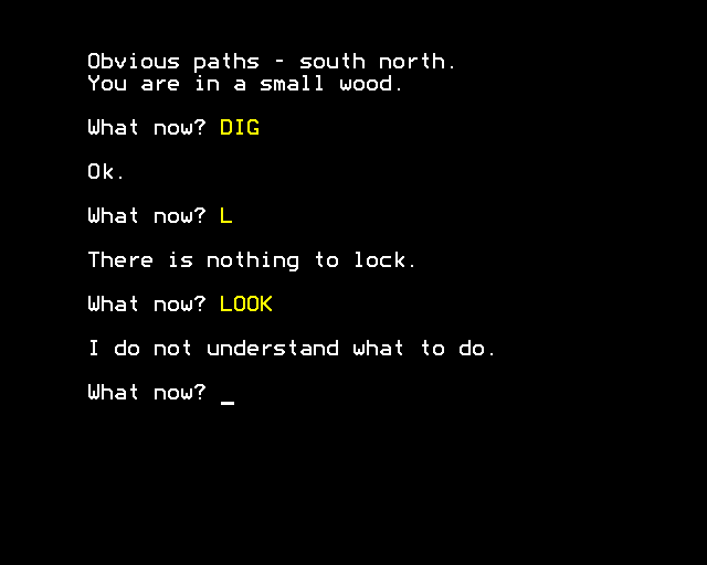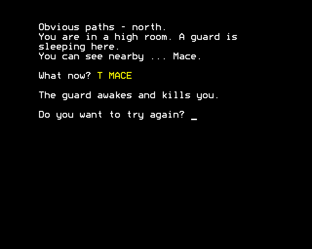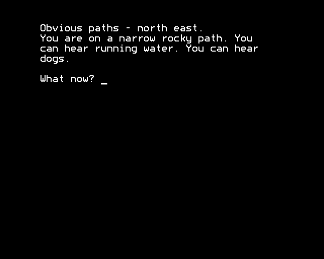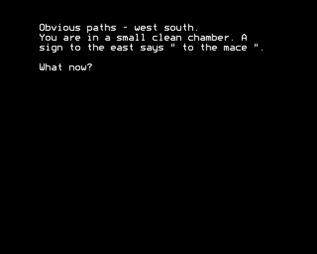 I’d forgotten how ridiculous the mazes are in this game; the author seems to have had a real fetish for them. I make it six if you discount the twisting paths through the woods and the mine. The one east of the “to the mace” sign is particularly scattergun.