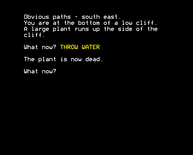 K speculated about chopping down the plant, which didn’t work. However, nearby there’s a “beach section” which has some brandy, and I tried refilling the jug with that and tossing to no effect. It was rather later that I realized that the beach also has access to a completely different kind of water which might be hurtful rather than helpful.