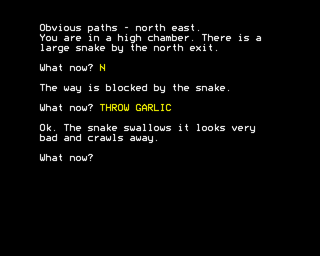 I rewound a bit and kept the garlic in case that was a softlock. Fortunately, there’s a bit later garlic is quite obviously helpful, so I guess it was. (One of the common themes in the game is having bits of the map change in their nature, so I can’t say the snake is entirely useless to deal with. Maybe, even, on the final escape from the kingdom, the snake will be moved as guard duty, and we’ll have needed to take it out earlier, and the room behind it is unneeded.)