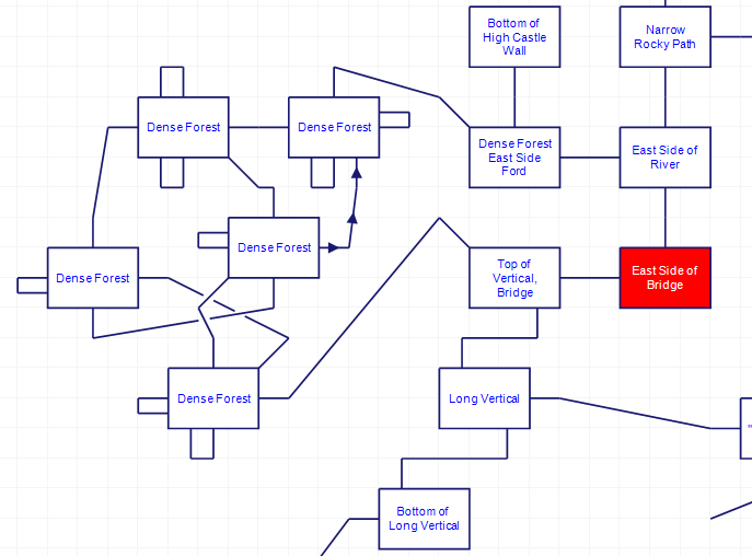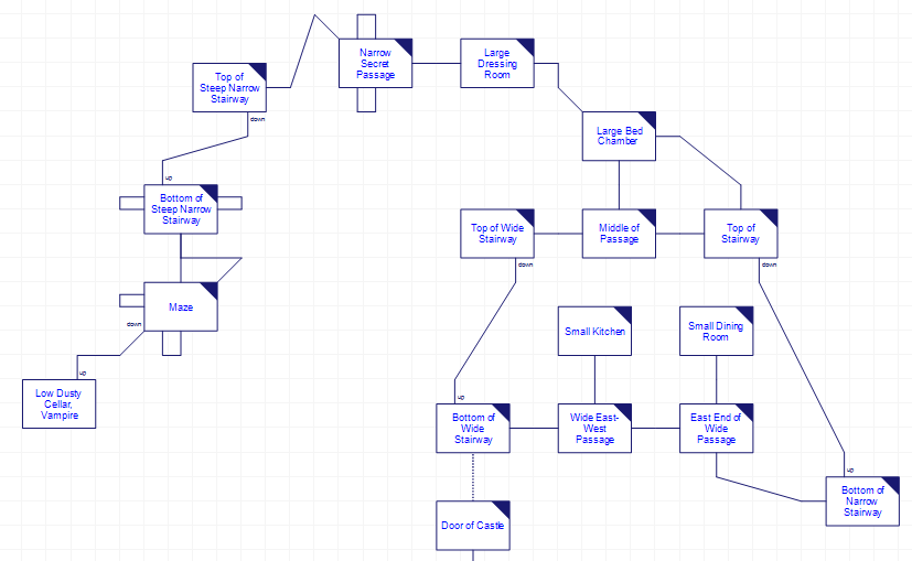 With that cleared up, I went back over all the rooms that killed me before to look for exits, and I found an entirely new area, in fact multiple new areas. Here’s a meta-map:
