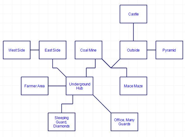 To be clear, this is meant to show the interconnectivity of the various regions, and isn’t exact about directions. Once getting by the coal maze you get into a “mace maze”, a small outdoors section, a castle, and a pyramid. (Well, theoretically a pyramid. I haven’t solved that part yet, but I have dealt with the others.)