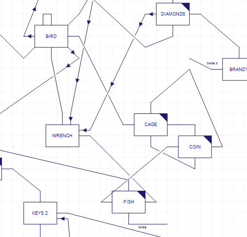 I confess, after realizing there was zero gimmick and I just needed to not only drop objects in rooms but tote them along to places farther in the maze (because I didn’t have enough objects for every single place) that I just looked up the route. I’ll suffer for your entertainment if it seems necessary but there just was no new point being made here.