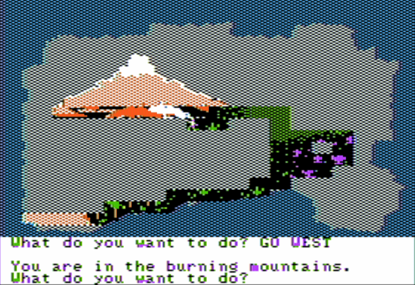 Leaving the castle results in a top down view. You can still GO EAST / WEST / etc. although for the most part (with one exception) the physical map isn’t important, because encounters are random.