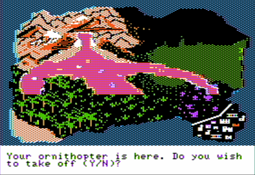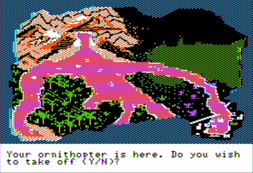 In Apventure there is an ornithopter that keeps landing and dropping off more monsters. You need to wait for the right moment — and it will tell you it isn’t a good moment if you do it early — and hit U for USE. Then you USE the spell PANIC HORN. This causes the monsters being dropped off to rage and the Atlanteans to get killed, leaving an empty vehicle that you are now able to board.