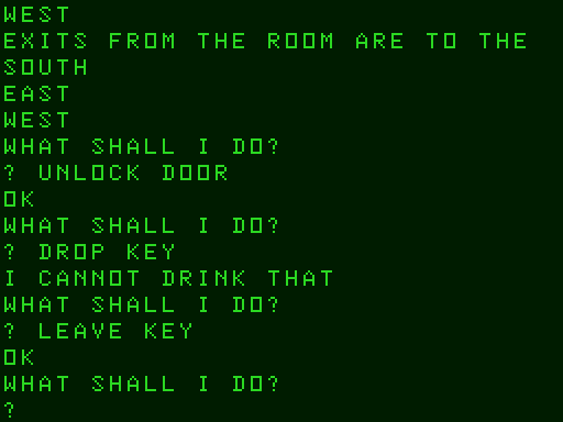 I played through, I am not kidding, 30 times. It started to get very repetitive. It didn’t help at the beginning that I was missing one of my search tools: a command that works, in addition to LOOK ITEM and MOVE ITEM, is LOOK UNDER. Not LOOK UNDER (ITEM), just the phrase LOOK UNDER. I missed it somehow perusing the manual but sometimes that’s how something you need is hidden.