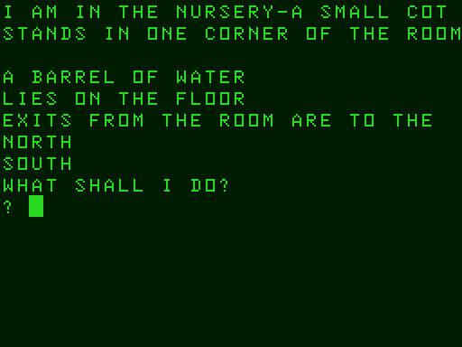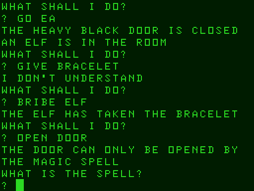Huzzah! I only found this post-game in the first version. The point is to make you think the game has crashed and you respond with the usual Apple II syntax of LIST 444 to debug the code. It is slightly less believable here, since the game doesn’t feel like it is about to crash otherwise, but I still can see an Apple user from the time being fooled into typing the code.