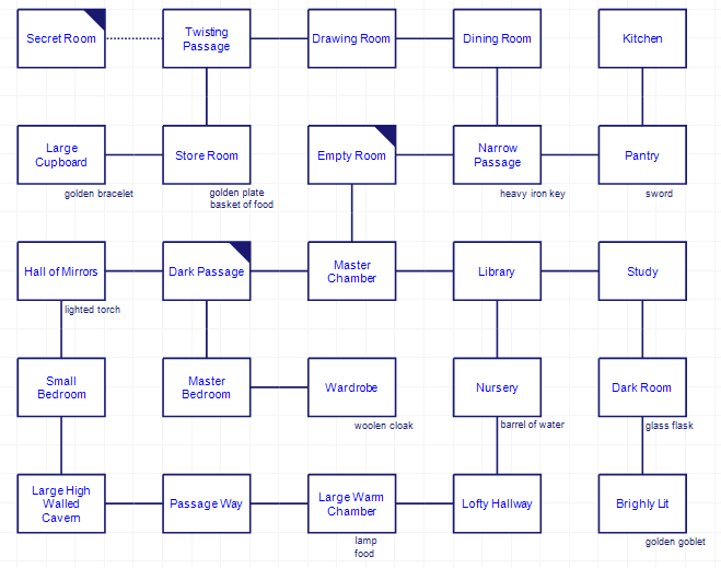 I started to get a pretty good sense of the generation plan the game uses. The game starts with Entrance-Library-Ballroom-Reception, with a clue 1 in one of the rooms, which opens a secret from there. The new section has a clue 2 somewhere in the first couple rooms.