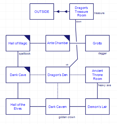 The weird effect of not being able to turn is that you can move “south” without seeing it, meaning there’s an extra layer of obfuscation to the game. At least with this map you have to discover the issue quite quickly to get anywhere (the third turn goes “south”) but check out this map I got playing 1.01 (note this is generated randomly, so if you play it will be different):