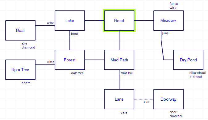 The opening just has a handful of generic-forest-adventure rooms (lake, meadow, forest, mud path, …) but a wildly unusual number of items just lying around. To get to the pond above I needed to JUMP over a fence, and the fence itself had a wire. There’s a boat you can enter that just has an axe and a diamond you can grab, there’s a “mud ball” that turns out to be a crystal ball if you just “clean” it (LOOK CRYSTAL: “I SEE A GOBLET AND A FURNACE”), and there’s an acorn up a tree.