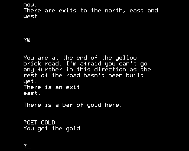One other subtlety I want to point out — and this is true of every area, not just this self-contained one — is how the structure of the text is part of the user interface. If we go back to original Adventure (the only reference for this game) there is one major standard established right away: