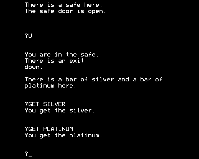 In the past I’ve tried my best to point out how the various text games I’ve played (despite a very common set of elements) nevertheless have strong fingerprints which distinguish them. This game is no different, and I want to do some compare-and-contrast with two sections. This is useful from both a history-of-games standpoint and a theory-of-games standpoint.