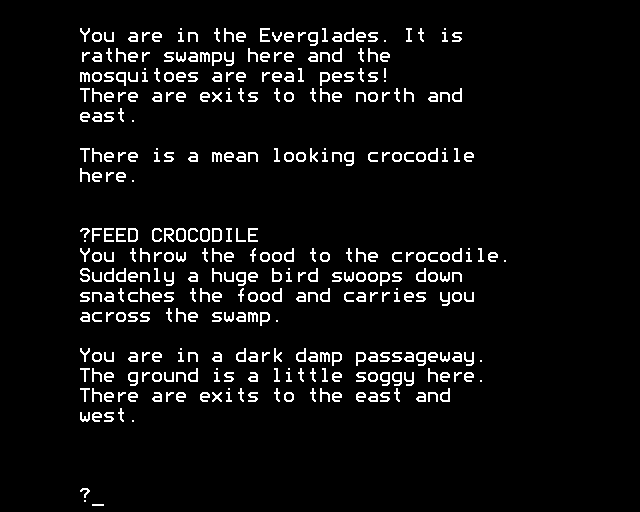 The upshot of the sequence above is that the trip here is one-time-only. You can safely go back in the Everglades, but the still-hungry crocodile will still chomp you if you try to go by again. Fortunately, there’s no real need for a second trip, because the whole area has no puzzles: just locations with treasures lying around.