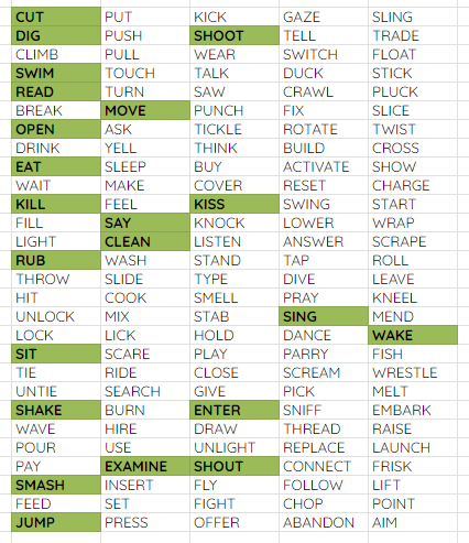 Given none of my items seemed helpful, I decided to noodle with making a verb list, which I hadn’t done yet. For this game testing is just a matter of typing the verb, if it is understood the game asks (supposing as an example the verb “smash”) “smash what?” If not understood, the game says “I don’t understand that!”