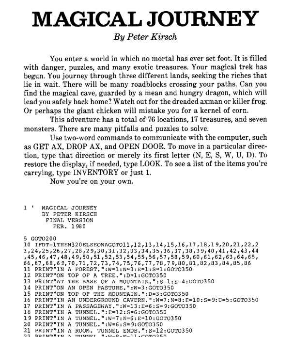 Magical Journey also brings us back to a familiar name: Peter Kirsch. He has been the editor (and often author) of the Adventure of the Month series (Arrow One was the latest one featured here). Not long ago I found, in a 1982 volume by Hayden (the book publisher who also put out Crime Stopper) a Softside compilation that also included an adventure game by Kirsch dated Februrary 1980.