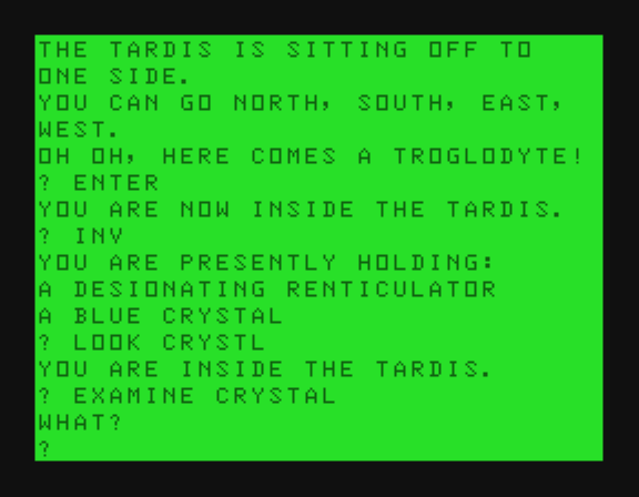 Outside of that, this game feels weird for a type-in. It’s already very large, yet it also feels like it’s missing a good chunk of it. Something about the locations you’ve explored seem…incomplete. Like there should be more there. Die-however you write it doesn’t seem to have anything related to the Doctor.