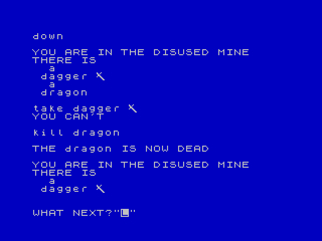 The very first room has a dagger and a dragon. The game informs you that YOU CAN’T if you try to take the dagger (you’re supposed to infer the dragon is stopping you — that’s true for messages in general in this game, like how you can’t go into the forest without the candle implies it is too dark but the game doesn’t say “too dark” or the like).
