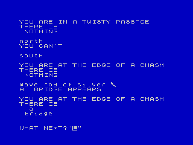 So does the game just generate a bunch of impossible maps? Well, no: the game lets you cheat, as a feature. When you die, the game kicks you out of the BASIC source code. Then you can type CONT or CONTINUE (VIC-20 or Spectrum ZX) and then game will resume in the next line, and act as if you caused a reality shift where you survived the obstacle anyway. If you die at a pit, you magically have a ladder (even if you really don’t, and it isn’t in your inventory after). If you are in a flooded room, you happen to have a boat.