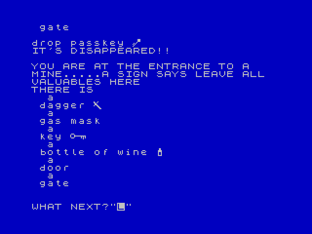 Typing LOOK GATE mentions “a keyhole” but just typing OPEN GATE or UNLOCK GATE (even without a key, I haven’t found one yet) just states “O.K.” The gate doesn’t actually open; it seems that a “you failed” message was never properly put into the logic here.