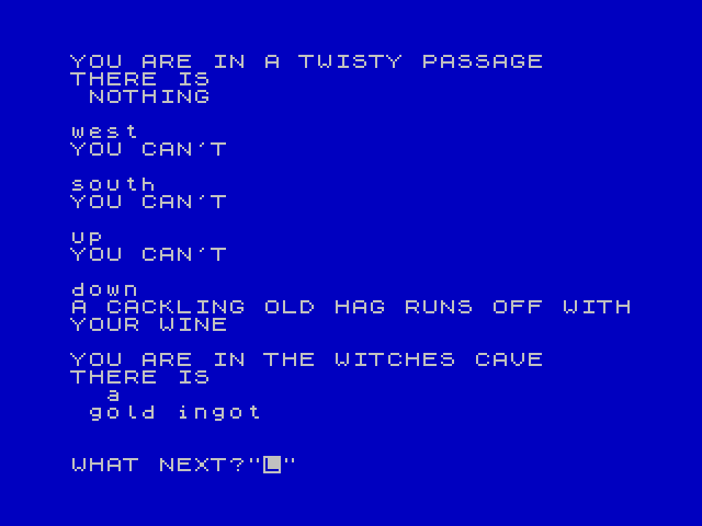 I recommend the solution by Exemptus if you’d like to read more details; in the end this was just a disaster. If the random generation had somehow been done carefully (akin to Mines from 1979) and the overall map was laid out properly, the concept would work. This could have been a proto-version of Tower of the Sorcerer-style games (*), except the author didn’t have the chops to pull one off.