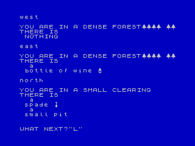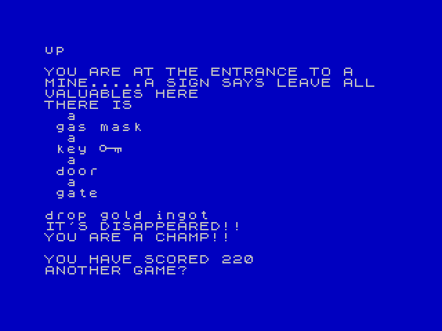 This has the simplistic minimalism of an early Hassett game, with a quite limited verb set: CUT, DIG, DRINK, KILL, UNLOCK, WAVE, JUMP. One thing it does have going for it (that I’ve yet to see in any game) is that the Spectrum character set attributes are used to make tiny graphics for the different objects.