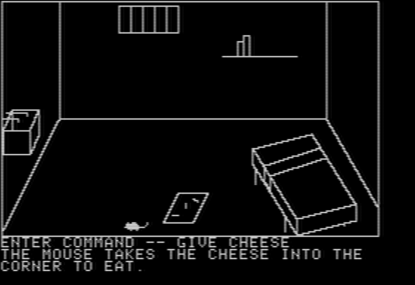 The food was an arbitrary guess — any puzzle that asks for a noun that the player hasn’t seen yet has the difficulty multiply by at least double — but there’s a mouse that occasionally is animated walking by and I suspected I’d get some cheese if I asked, just because that’s almost guaranteed from adventures of this era.