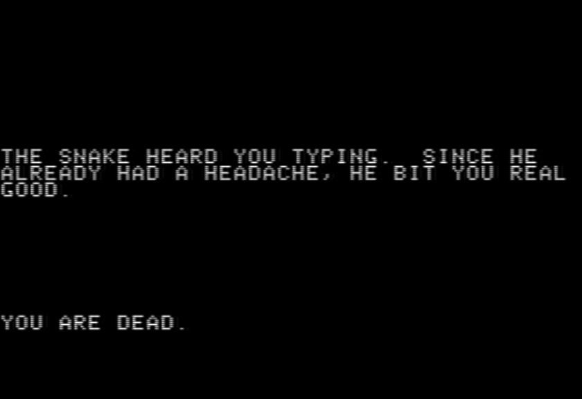 Since there’s no weapon otherwise aboveground, your only choice is to follow the curious directions at the start and try to KILL DRAGON and just press ENTER when the game asks you with what. This is invoking yet again the “kill the dragon with your bare hands” moment in Crowther/Woods Adventure.