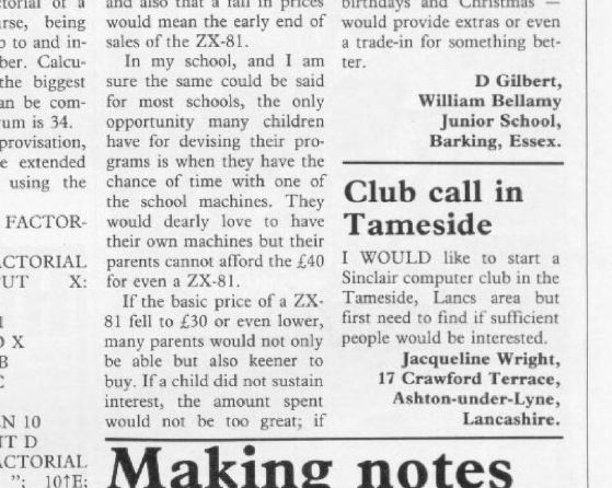 The four games being advertised (In Search of the Quill, Gunpowder Plot, Dr. Watt and the Darlics, Hells Bells) were all adventure games written by the person mentioned in the ad (J. Wright) so represented yet another one of our bedroom coders who self-published in the UK. The difference with J. Wright and our other bedroom coders is that J. stands for Jacqueline. This is the first author we’ve had of this sort that’s a woman.