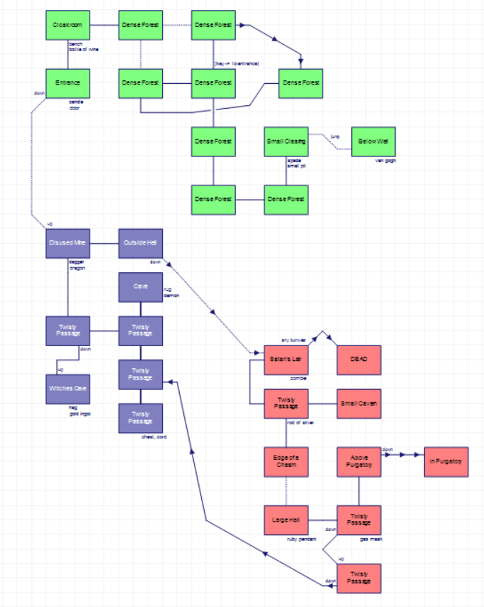 The original Quest game was essentially a big logic maze where you had to work out the right sequence of moves to pass through safely. For example, with the meta-map above, your goal is to start at the opening area, go and get a key, return to the opening area to open a chest with the key, then escape back out.