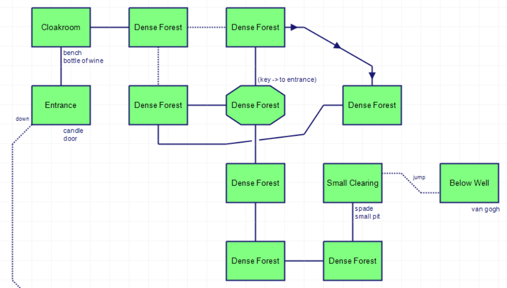 The first phase, aboveground, you need find a key for the locked door to go belowground. This involves taking the candle (you can’t go anywhere otherwise, I suppose this is deepest night) and stumble around the forest until you get to a room with a pit and a spade.