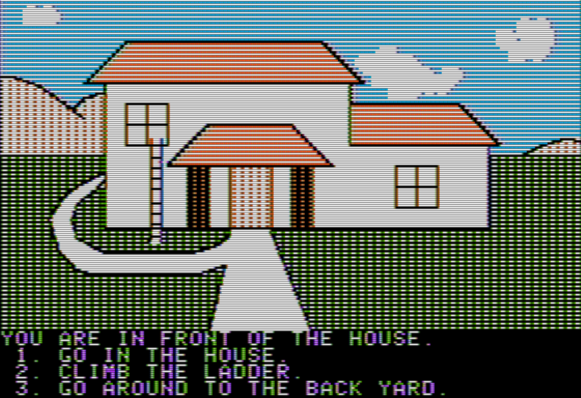The last extremely-tight-sized game we’ve had with graphics was Adventures in Murkle for the TRS-80, done in a 4K using glorious ASCII. That game built the outdoors by having a set of graphics that could be turned on and off: some trees, a stream, a building.