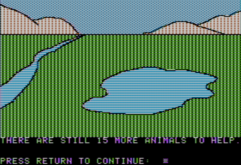 The cave to the south makes an interesting choice for the graphics by going abstract. There’s a small box that gets filled in different ways with squares. I like the idea of non-literal graphics and I can’t think of any other game that quite does it this way.