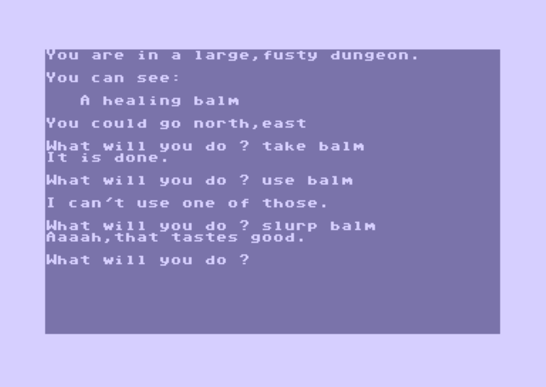 Unless I’m overlooking something, there’s no “end room” treasures should be brought to, either; this is like Fantasyland (the surreal Canadian VIC-20 / C64 game) where the goal is to get maximum treasure in your inventory, not in some specific place on the ground.