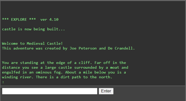 Medieval Castle marks the last of a trilogy by De Crandell and Joe Peterson, who wrote an “Explore” system for the TRS-80 as a system for their games. They were private rather than distributed, and only placed on the Internet much later. (See: Enchanted Cave, Lost Mine.)