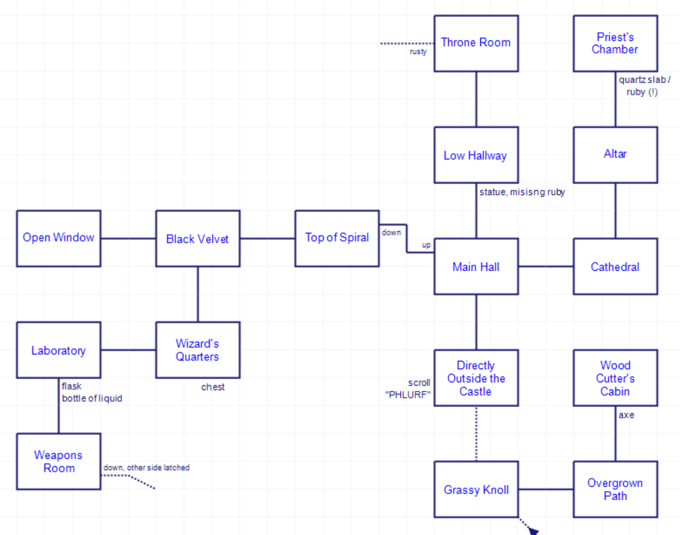 However, unlike those games, I haven’t been able to beat the rust. Upstairs there is a “wizard’s laboratory” with a “flask” and a “bottle of liquid” but neither is helpful based on any command I’ve tried (OIL DOOR, POUR LIQUID, THROW FLASK, etc.) I know the bottle is toxic because it kills you if you drink it but past that I’m baffled.