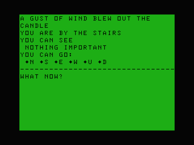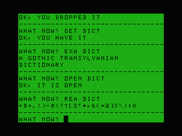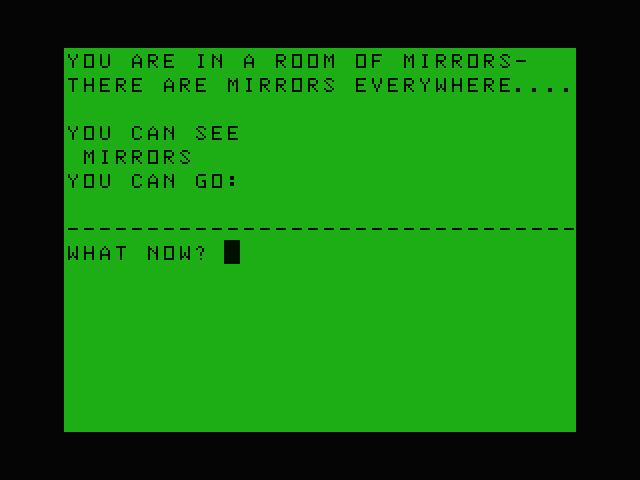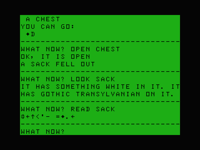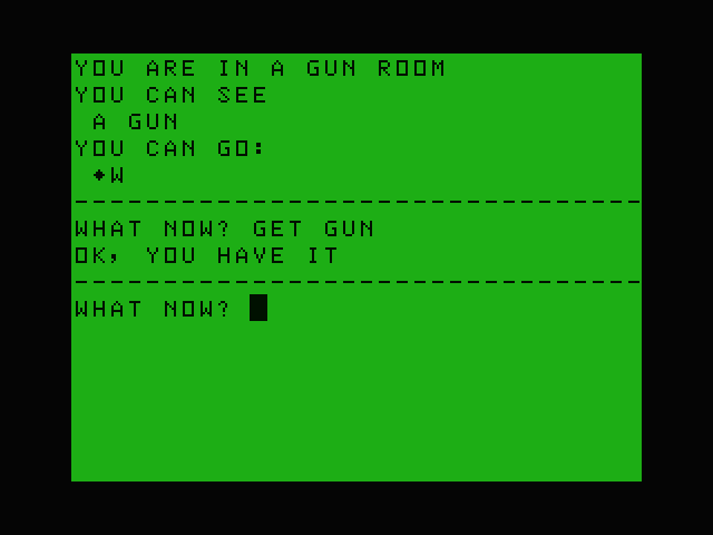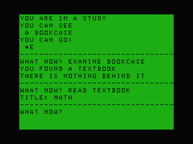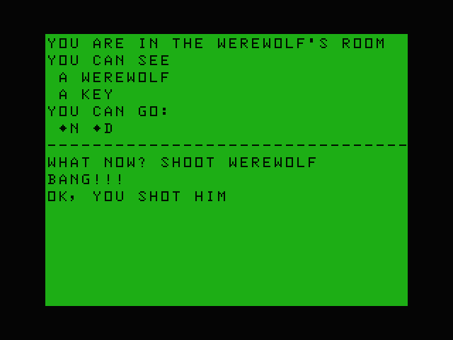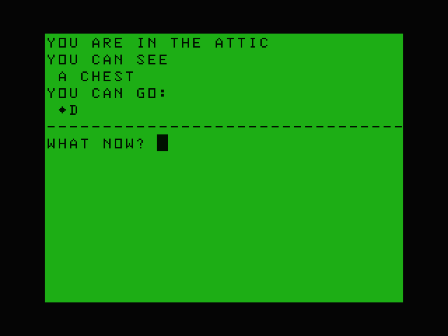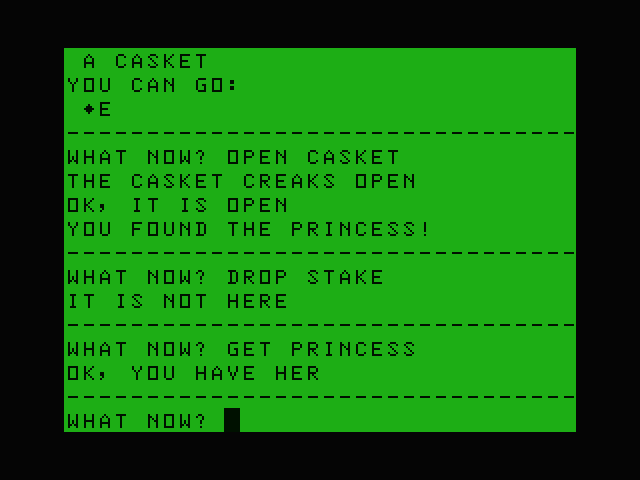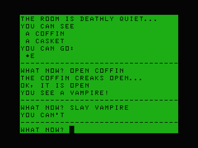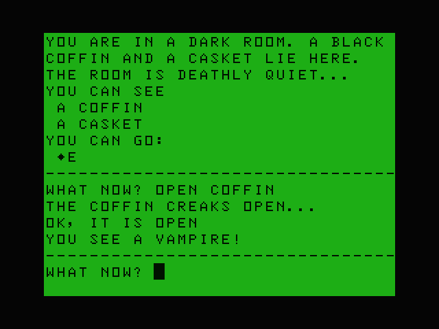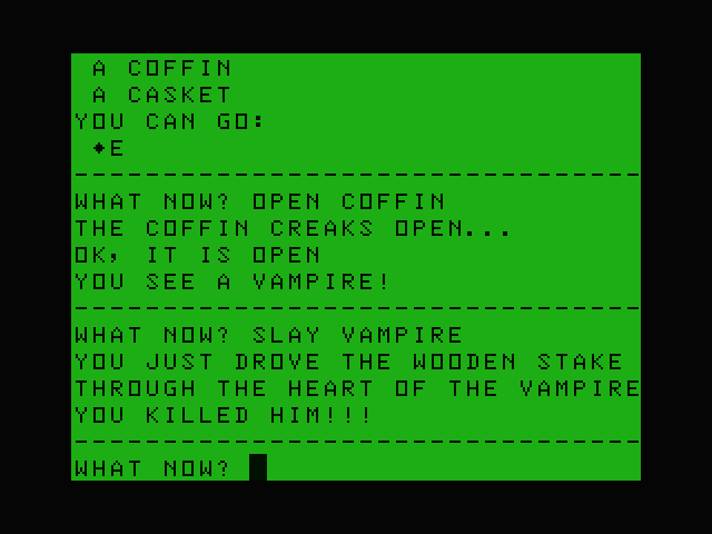 OK, fine: I appreciate the various fake-out moments were a general theme (wrong exit down to the vampire, wrong hammer, wrong victim) so it made the story feel more dense than normal. As whole this held up much better than I’d expect from such absolutely minimal parts. Mansion of Doom built good atmosphere with just single-word room descriptions.