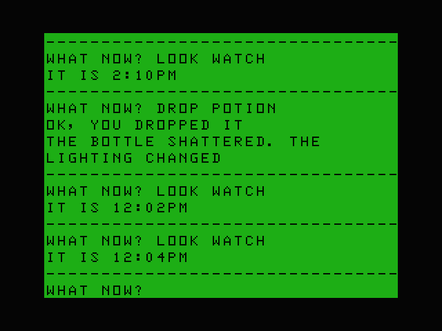 A sign near where you find the watch says “time backwards”. What this is referring to is a magic potion elsewhere that is marked as “EMIT”, and if you drop it time will reverse back to noon. This gives you extra turns in case you’re short and sunset is approaching (again, I ended up not having to use this in my final run; the main time save is that information given doesn’t change, so you don’t have to re-locate the clue messages on a repeat playthrough).