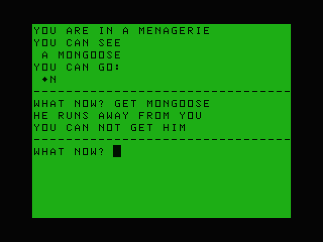 There’s a cage elsewhere and I thought holding it or dropping it would help, but no dice, I was getting the same “RUNS AWAY FROM YOU” message. There’s a rat nearby (which I thought I could use to attract the mongoose) but it eluded my efforts too, so I went even further down the food chain and tried to grab some worms (the game just doesn’t let you).