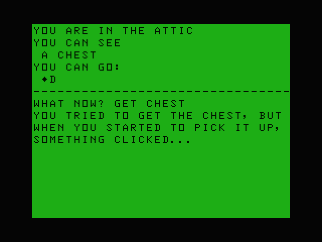 I hadn’t mucked with the attic much, since OPEN CHEST gives the response the chest is locked, so I figured I just needed to wait until I obtained the key, which meant finding the gun before messing with the chest. However, if you try to GET CHEST a trapdoor opens up.