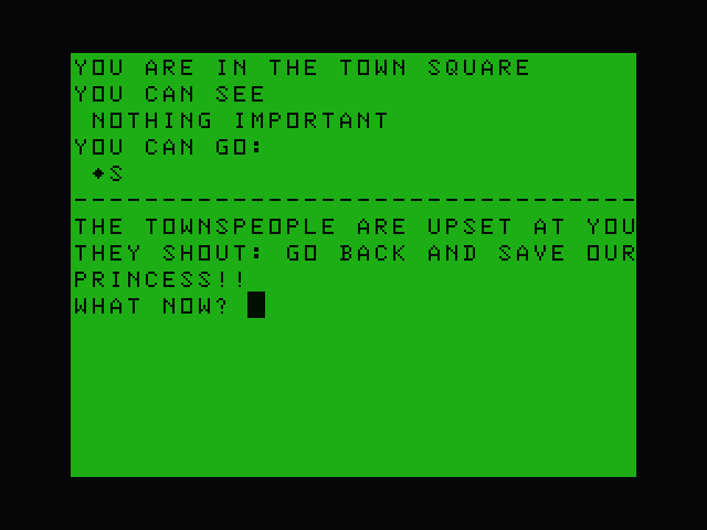 With princess in tow, I went out to the front door and … nothing happened. I assumed there was just some sort of automatic “travel home” sequence — how’d our main character get here otherwise? Deeply puzzled, I had to plunge into the source code, and found that in the “mirror maze” area, one of the exits mysteriously takes you back to the Town Square. Not exactly where I’d be looking for the path home!