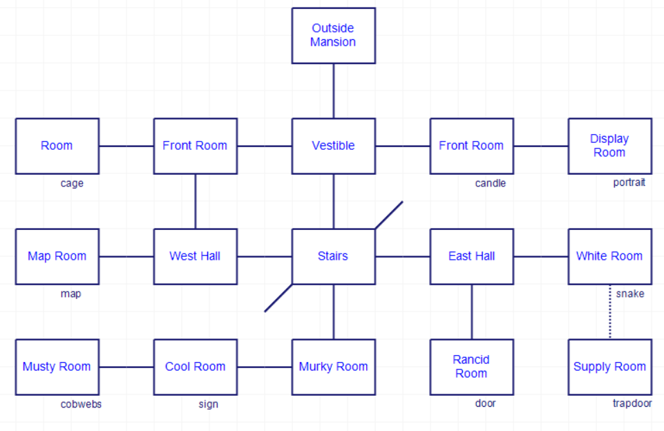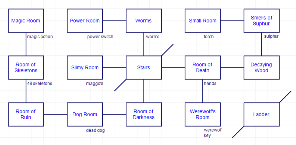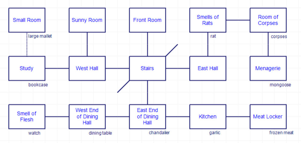 However, it works out because the game sticks to a rigorous map: three floors aboveground plus an attic, and two floors belowground, where each floor is a 5 by 3 grid with stairs in the middle. The sense you are filling in a map lends a sense of continuity many adventures of this era lack, and the game is able to add anticipation with “gaps” also do a couple “fake-out” moments where it looks like an exit exists which doesn’t work. For example, on the map below showing the first floor, the “rancid room” has a stuck door on the east wall which simply won’t open; you’re supposed to get to the southeast room via passing a snake from the north instead.