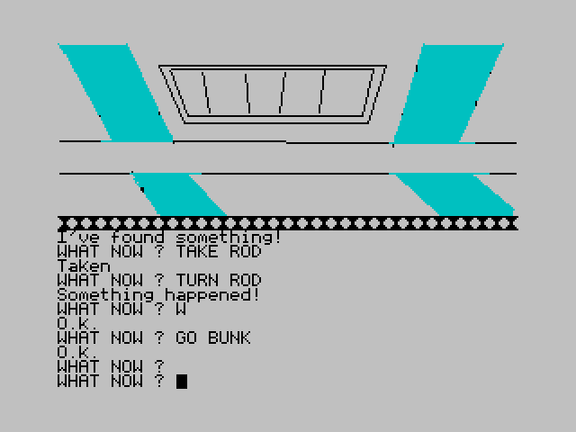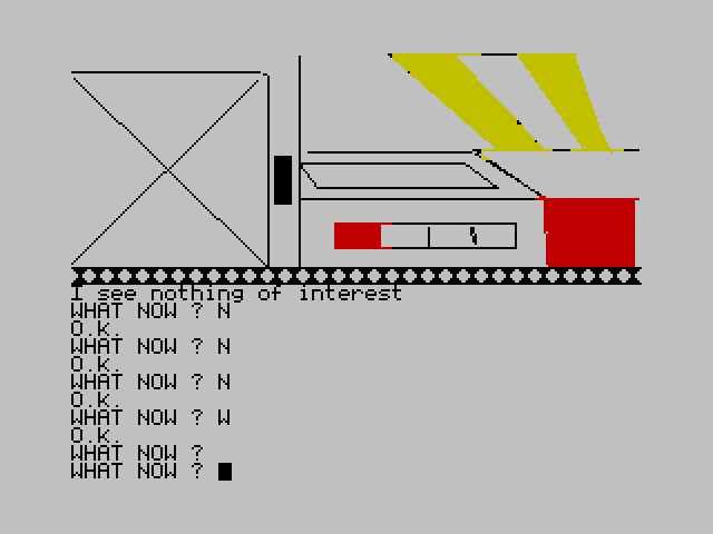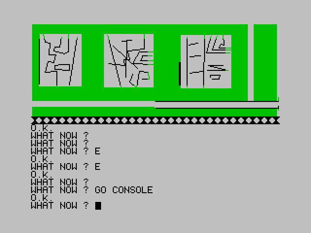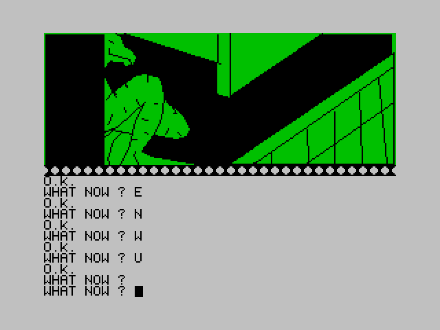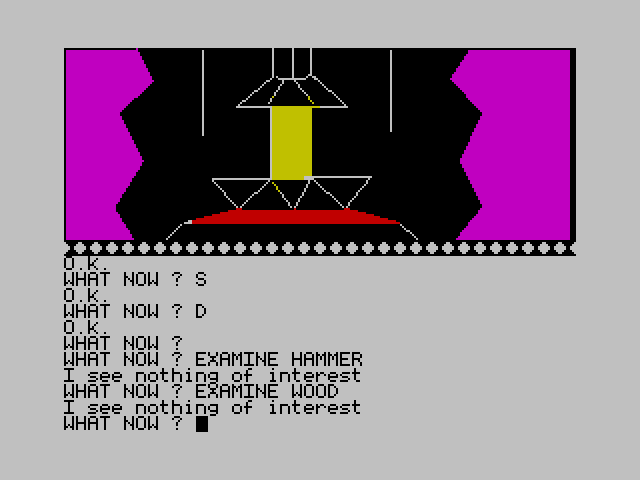 We’re also back to how the graphics system is oriented with the text system, which is you need to hit ENTER to switch from the picture and back. Enough information is given on the text portion you really need to be looking at that most of the time. Hence gameplay involves playing the game like a normal Scott Adams joint, except every time you enter a new room, you’re supposed to peek at the room’s picture (a process with a very small draw speed at authentic speeds) and flip back again afterwards.
