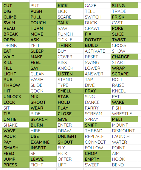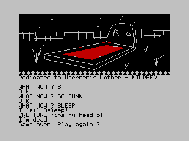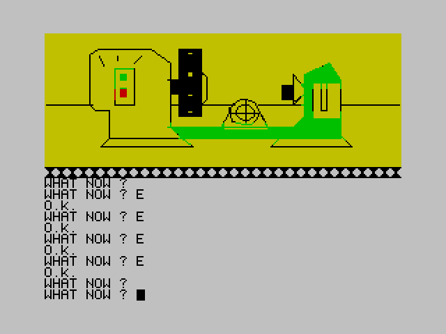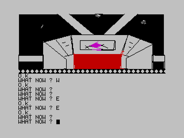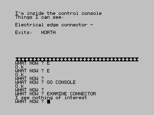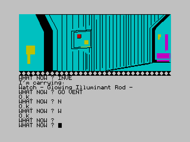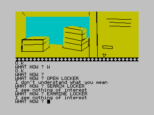 It seems like a lot of coverage! But given the cake, and a bit later where there’s a locker that can’t be opened, this isn’t the greatest of parsers — “knowing” a word in the vocabulary database isn’t the same as having a good response to using it, or at least a response that makes clear why the action isn’t working. There’s a “closed steel door” at the start of the game (which you arrive at the other side of after using the vent); “OPEN DOOR” says “Sorry” and you have to just imagine what’s going on, since the room is enterable from the other side (and then you’re trapped in again).