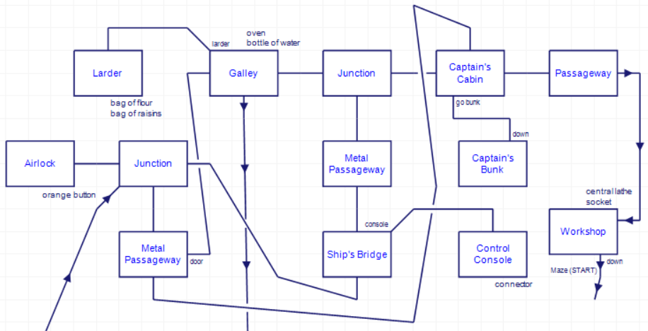 The “Galley” connected to a “Larder” has a bottle of water, a bag of flour, and a bag of raisins.