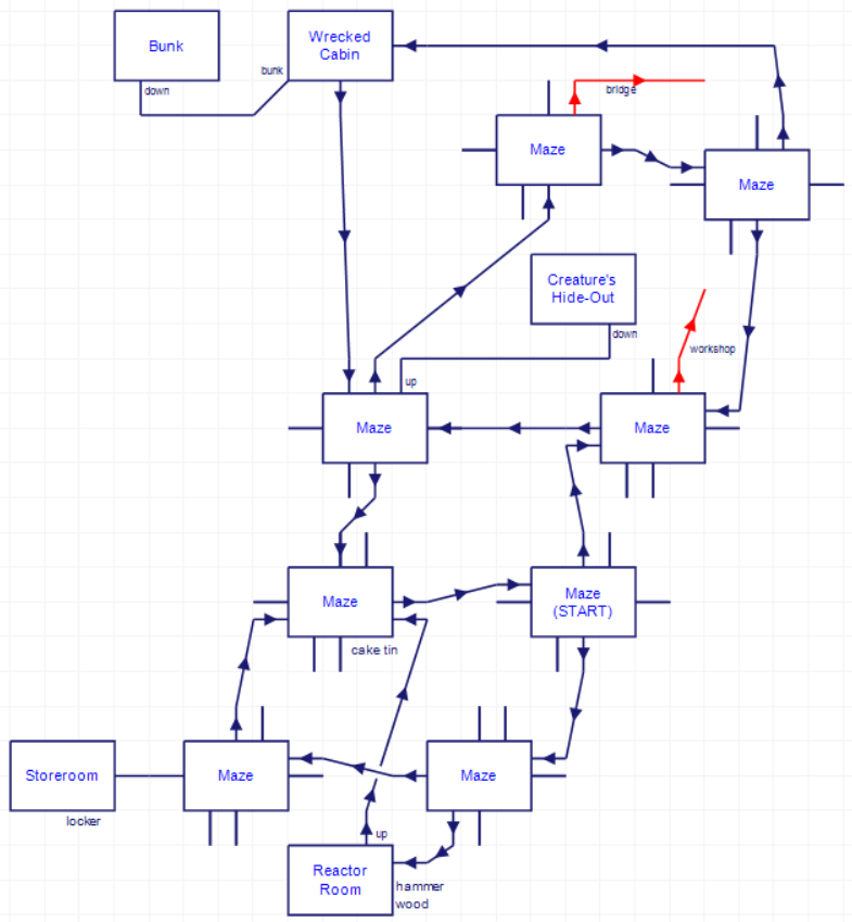 Going down from the workshop leads to a maze. The maze has a lot of “loop back to the room you’re in” exits, so when mapping them out I used a line stub to indicate the loop for a cleaner image. Additionally, “up” is on the northeast side and “down” is on the southeast side of each room.