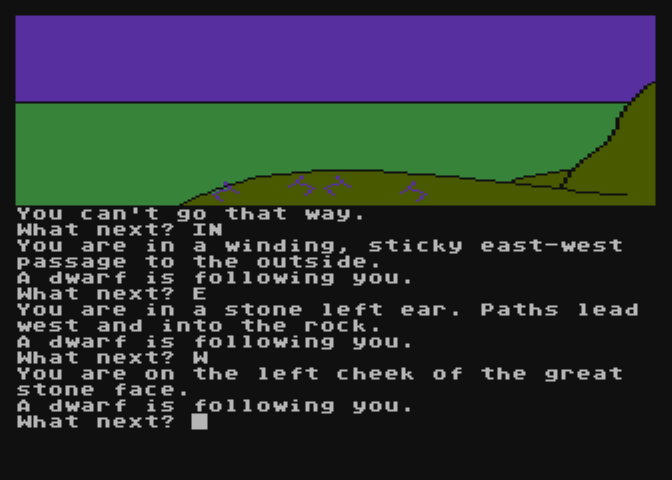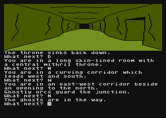 So the masked man is omitted in the graphical version. I admit I might be worrying the twig was a puzzle somehow in the Atari version. (And yes, I started thinking maybe I should just swap over to text, but given I’ve been showing off the graphics of the other two games I want to take this to the end. Plus: sometimes having less text can be helpful, because it reduces obsessing over details that are there just for color. One thing I can say is that I have found zero Tolkien references in the original ’82 version except for a Minas Tirith reference in the manual.)