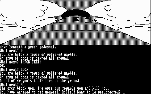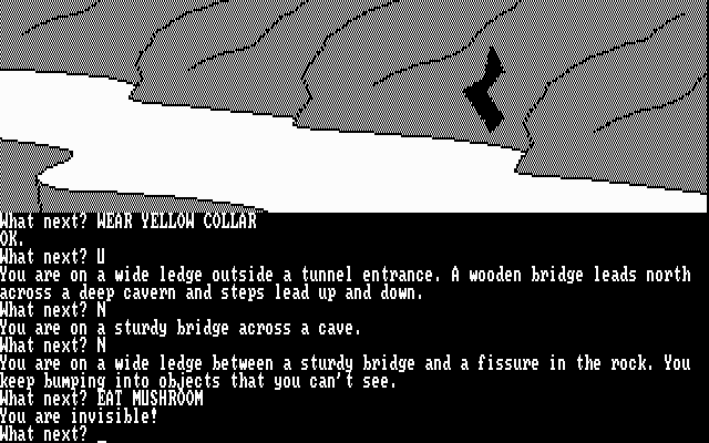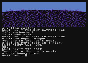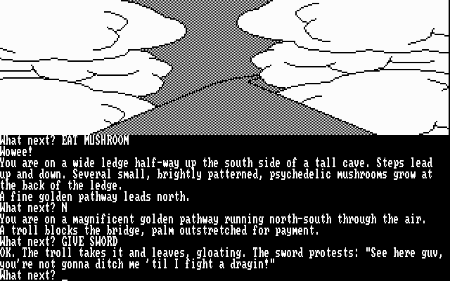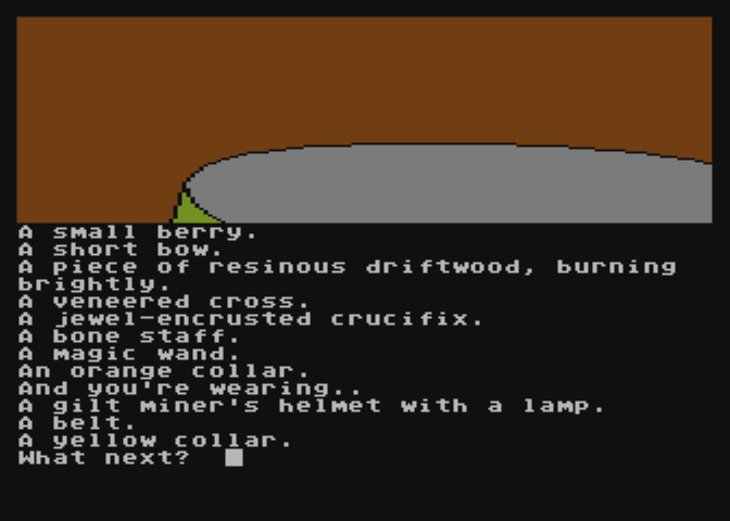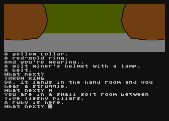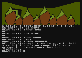Say YES to the Dryad: she will give you a “valuable” carving and make the tree drop all the stuff it is holding. (One thing I should point out that Level 9 has been doing that not many companies have — this puzzle does not care which objects you throw, only that there are six of them. The berry I threw at the giant at my last post can be any item at all. The mere presence of a object sometimes solves things in Level 9 games, without reference to what that object is.)