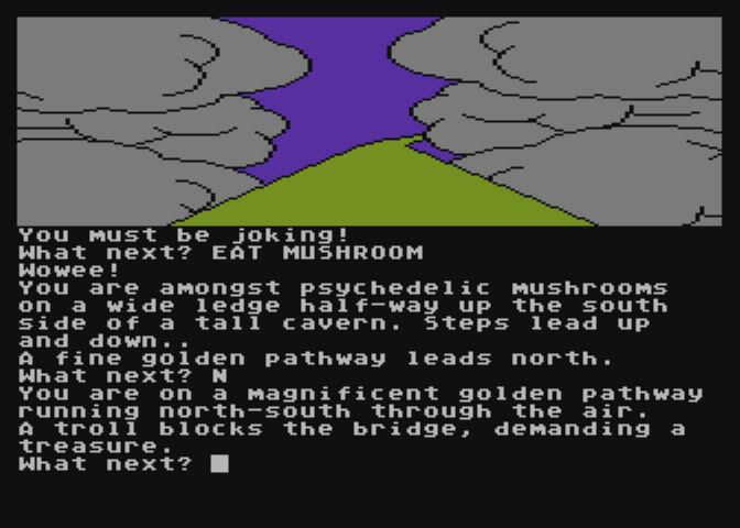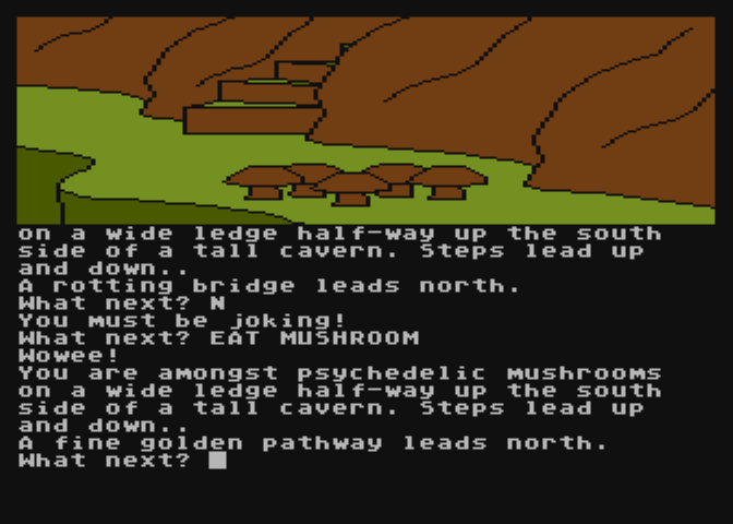 Then the door of the black tower is locked. D’oh. I assume this bit must come later in the game. Heading back instead to the “Steps” adjacent to the Jelly on my meta-map (there are two exits which go back to the Jelly Central region, and they are two-way), there’s also a “rotting bridge” next to it and some “psychedelic mushrooms”. If you try to head north the game asks if you’re joking, but if you eat the mushroom first, everything’s just fine! Welcome to the “magnificent golden pathway”.