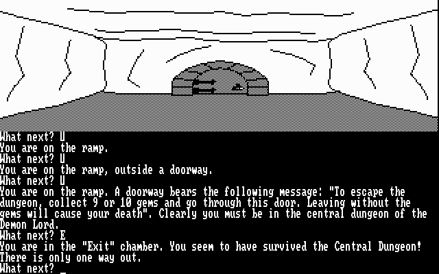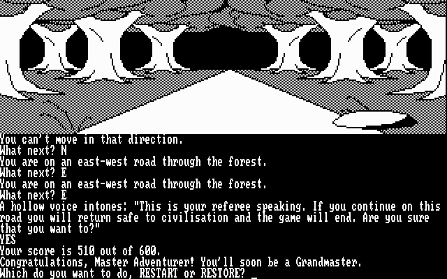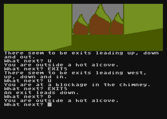 That’s everything (?) outdoors. There’s nothing going on with the giant tower, although the BBC version includes a reference to it as a “ruined tower” in another description. I think it’s either for decoration or going to be the last place visited in the game. Colossal Adventure had a plot twist once you gathered all the treasures; this might be going for something similar where we still have to defeat some Ancient Evil for the real ending. Still, maybe not, especially because the game lets you flat-out leave whenever you want. Back at the sleep-trap the exit to the east has a “referee” announce that going that way will end the game, and you are welcome to do so and take whatever points (and treasures) you have gathered. The world is not described as ending because of this.