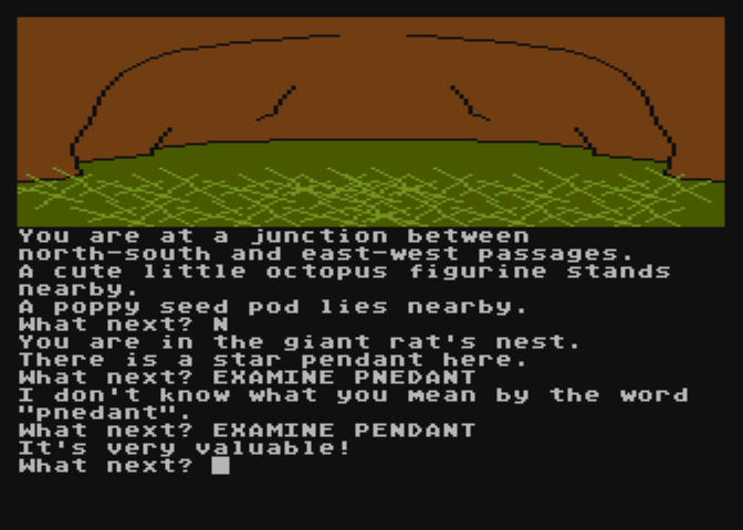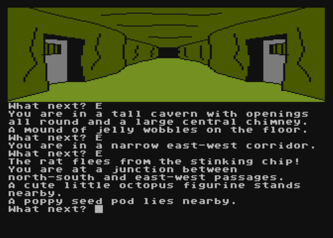 With that resolved, what about the other puzzles! Two of them were solved by the same object, specifically, a poppy seed pod that makes loud noises when you drop it. I had kept playing with the BBC version for a bit and noticed the bird on the nest is described as having “large ears”. The same description is in the graphical version but somehow my brain didn’t zero in on the hint in that setting. (This may have been a circumstance that I’ve mentioned before where playing the same section in two different ways — even if there’s no change in text at all — can have my brain approach it “fresh”, like I had a second person helping cooperatively over my shoulder giving advice.)
