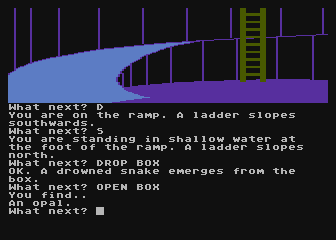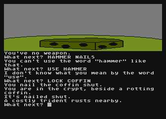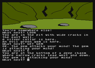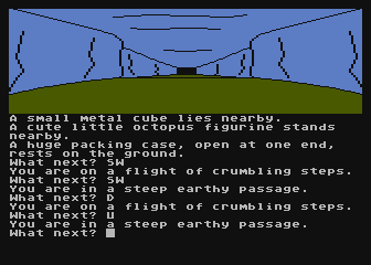Aardvark is a company I’d never heard of before starting the project, but we’ve spent an awful lot of time with now. They originally wrote their games targeted at the ludicrously small-memory requirements of the Ohio Scientific Challenger 1P computer, and made some odd parser sacrifices to get there (like only understanding the first two letters of each word). Despite this they’ve been rather clever in terms of geography, with (for example) Bob Anderson’s Circle World having a fair number of locations only reachable by teleport, but having all areas united together by the end. Earthquake, the game we most recently looked at, had an almost completely wide-open map, but led to puzzles where the thought process sometimes went “what store would have a solution to this” and not simply thinking about items.